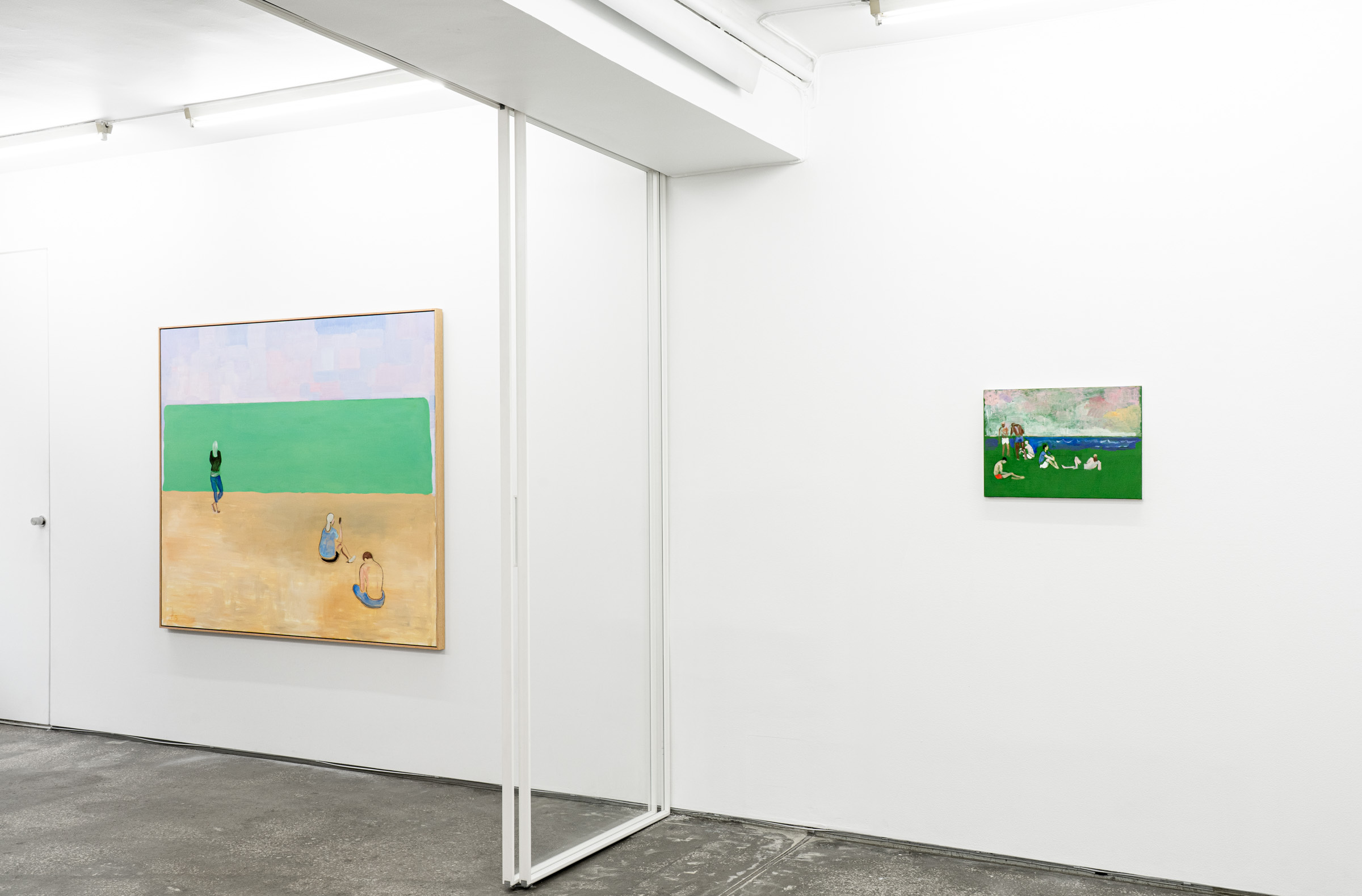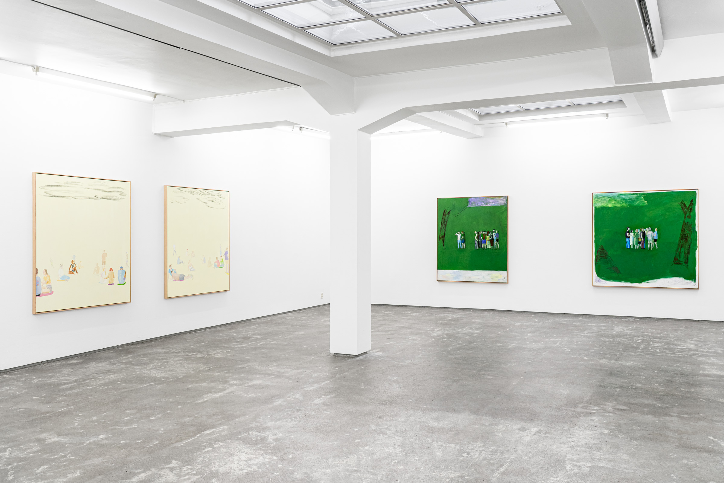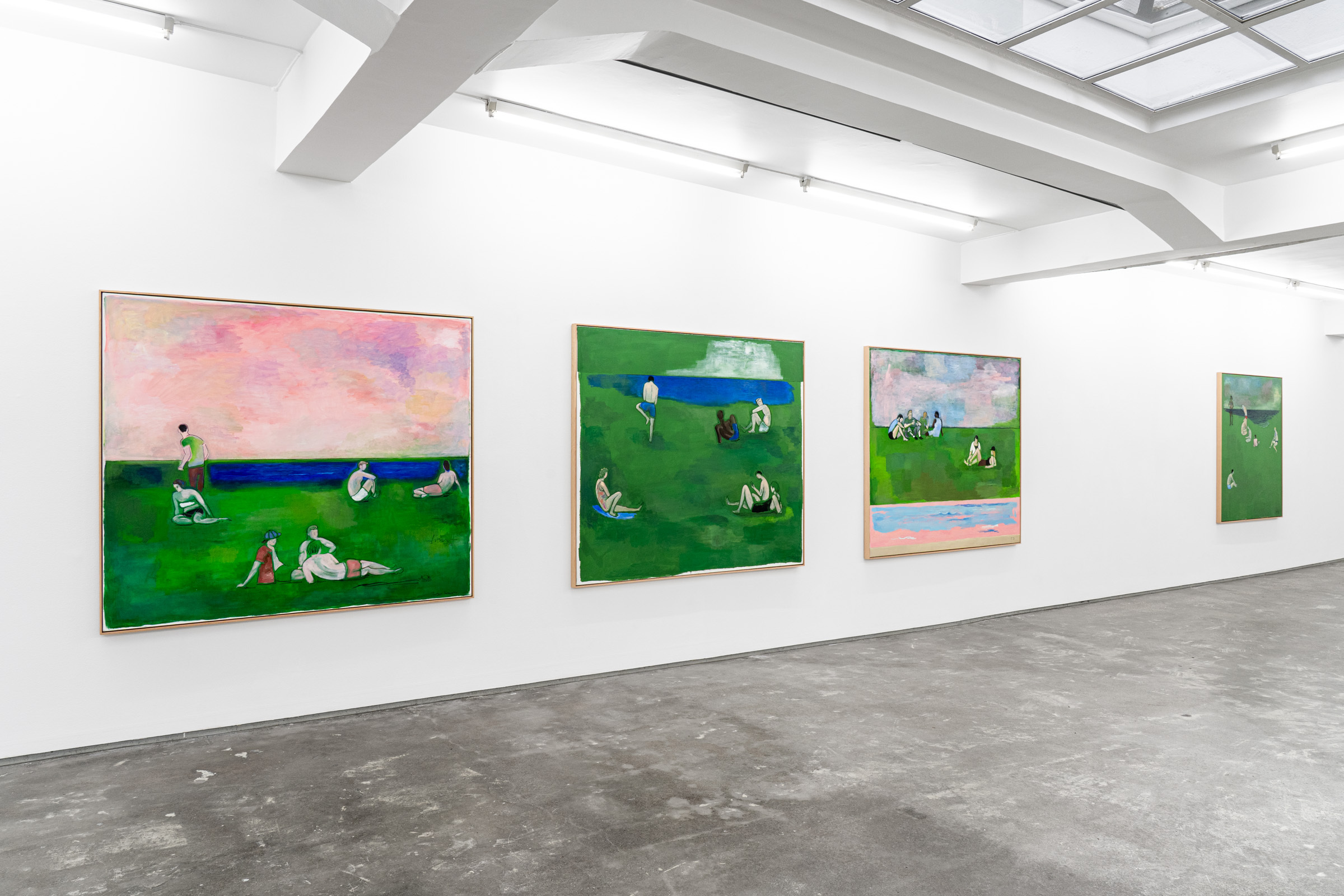 Peppered throughout, they are seen huddled together in groups or alone—heightened further by the sparsity of the compositions. A tension is formed and the scenes almost become voyeuristic. Nearly all of them have their backs facing us, forcing the viewer into the scene to observe their behaviour or their perspective. Others have an avoidant gaze: they look out to the distance, converse, scroll on their phone, sunbathe, recline and rest. They’re not overly fussy or stylised, no distinguishing features. In some instances, their limbs faintly appear through simple swoops of paint, almost dissolving into the park itself.