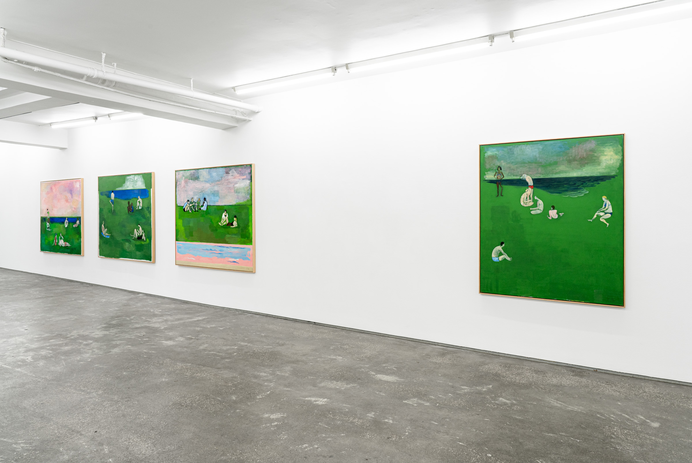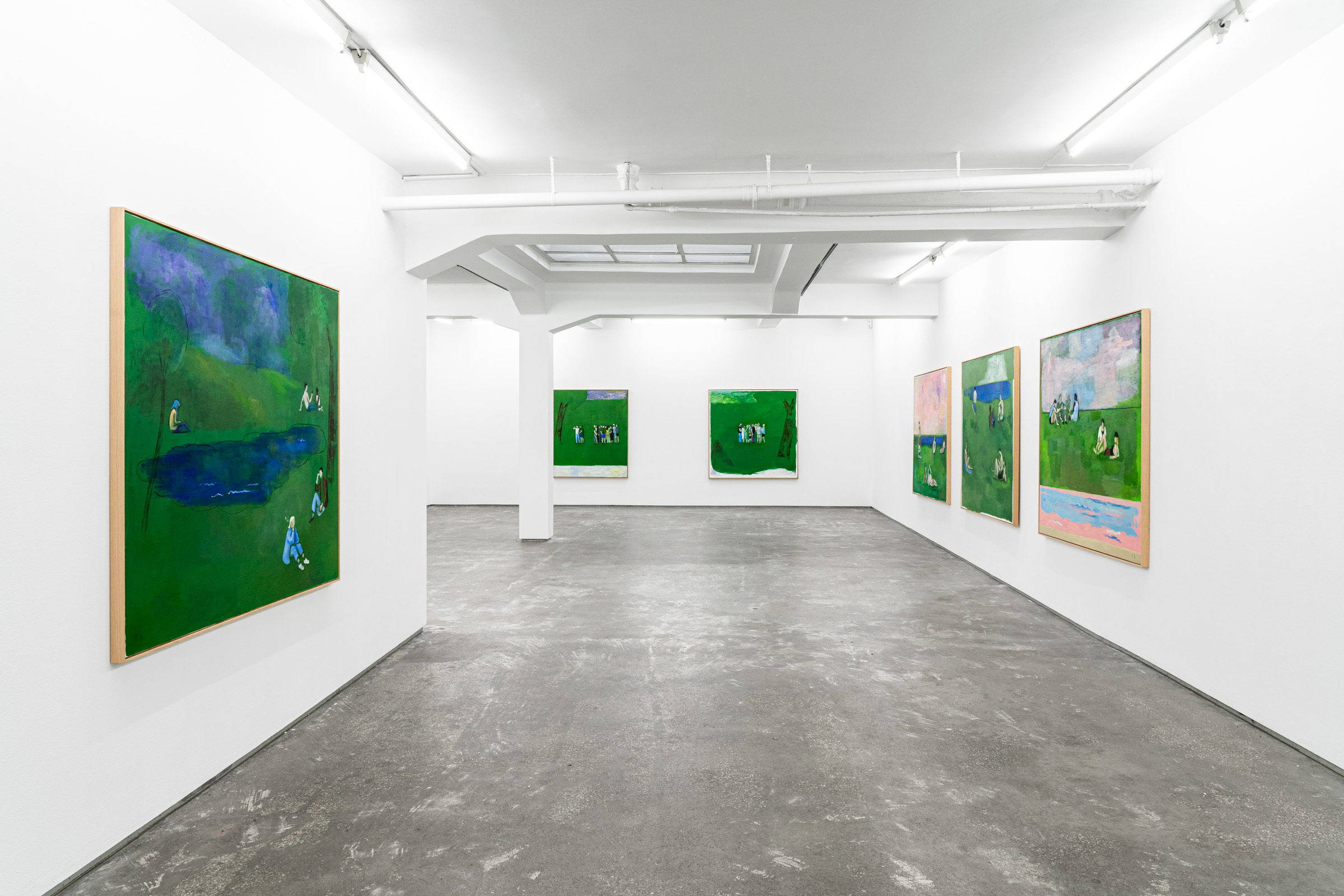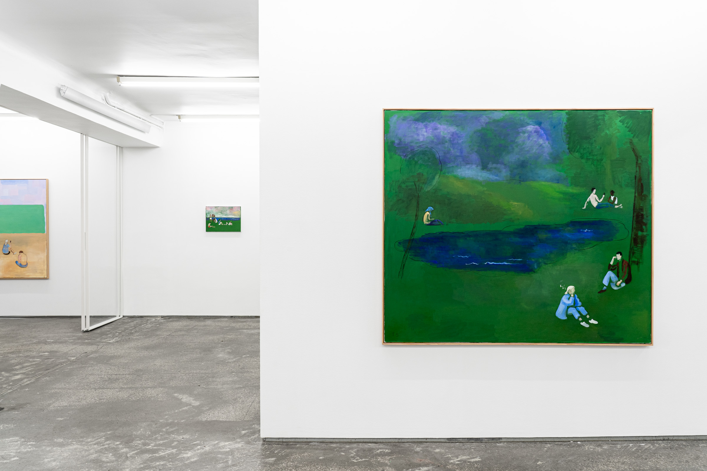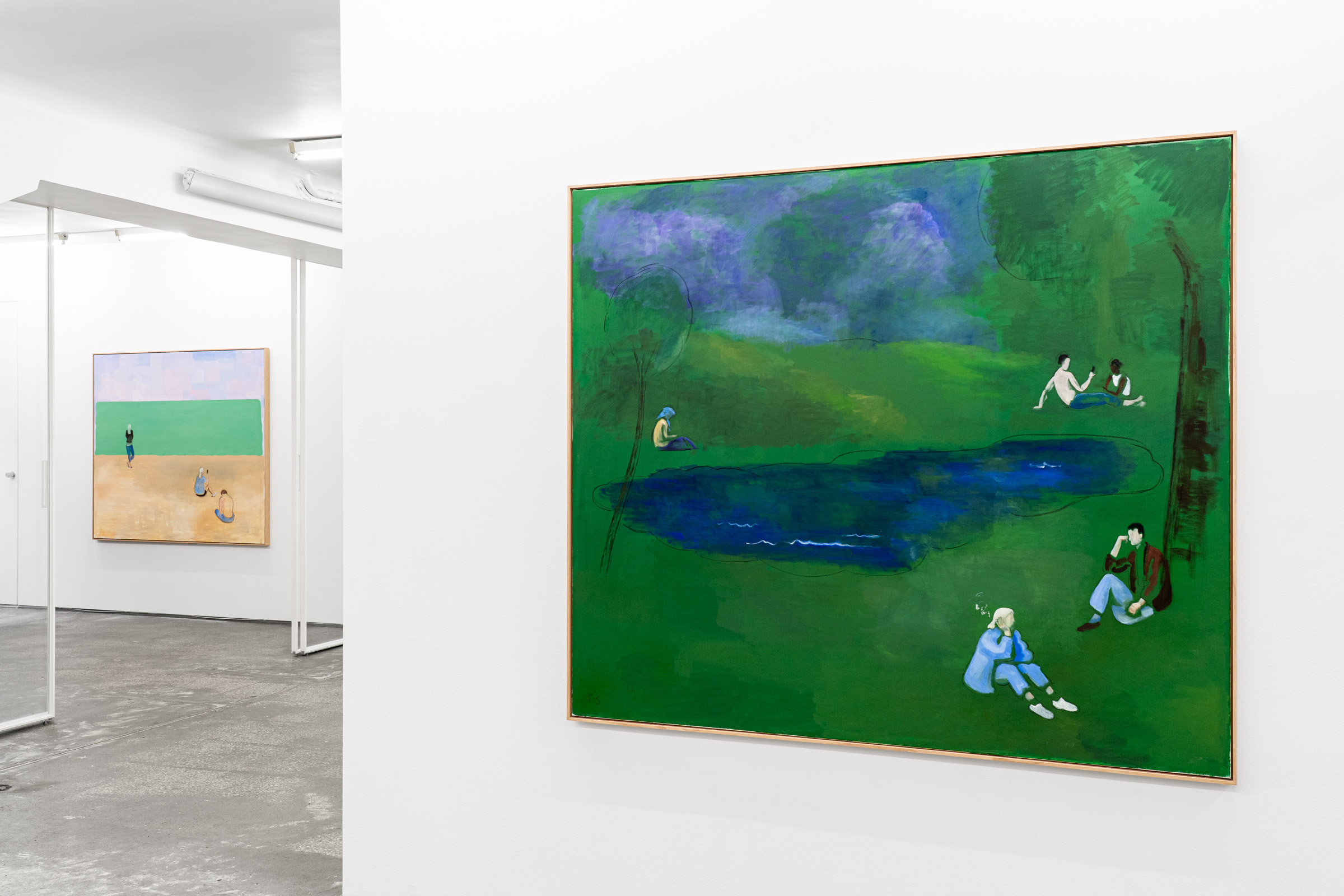 Figures emerge from lurid green canvases coupled with gestural black lines or soft painterly marks that demarcate the luscious grass, tree canopies, the horizon, the sea or the sky. Some feel cartoony, while others recall the dynamic painted skies of J.M.W Turner. “These aren’t necessarily figurative” Sørensen explains, “but are compositions made up with bodies.” Rather than attempting to capture the likeness or identity of the individuals depicted, Sørensen focuses on the atmosphere of a place through an investigation of form, line and brushwork resulting in unexpected configurations.