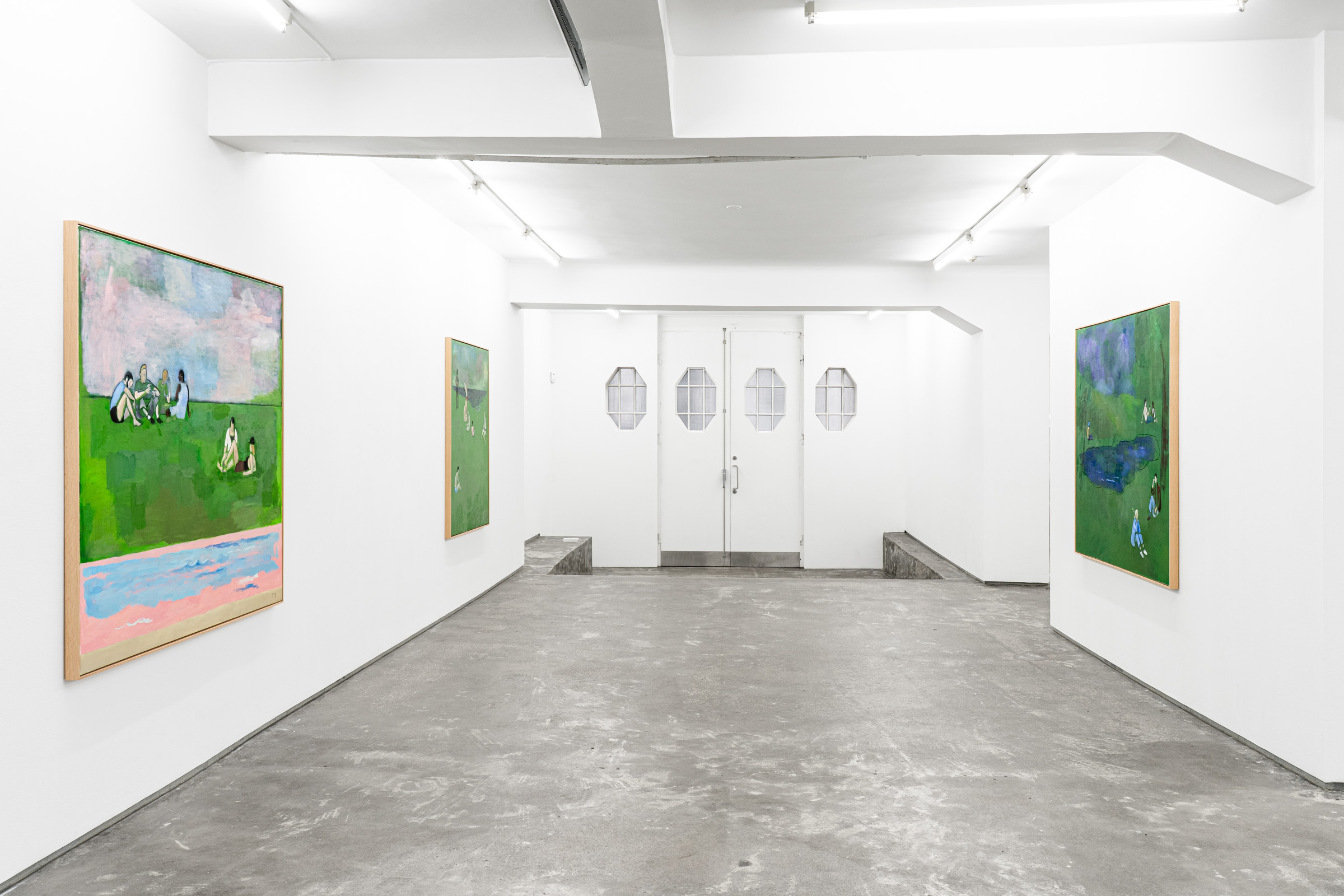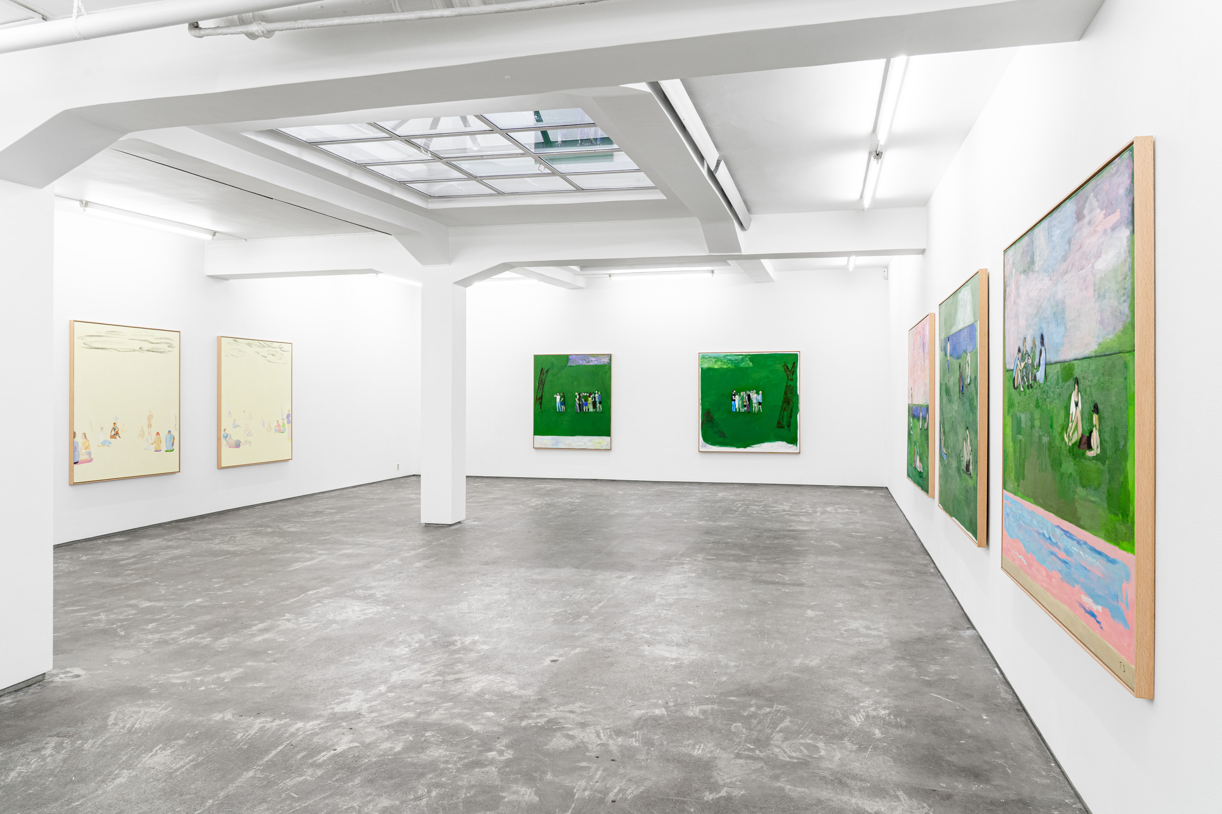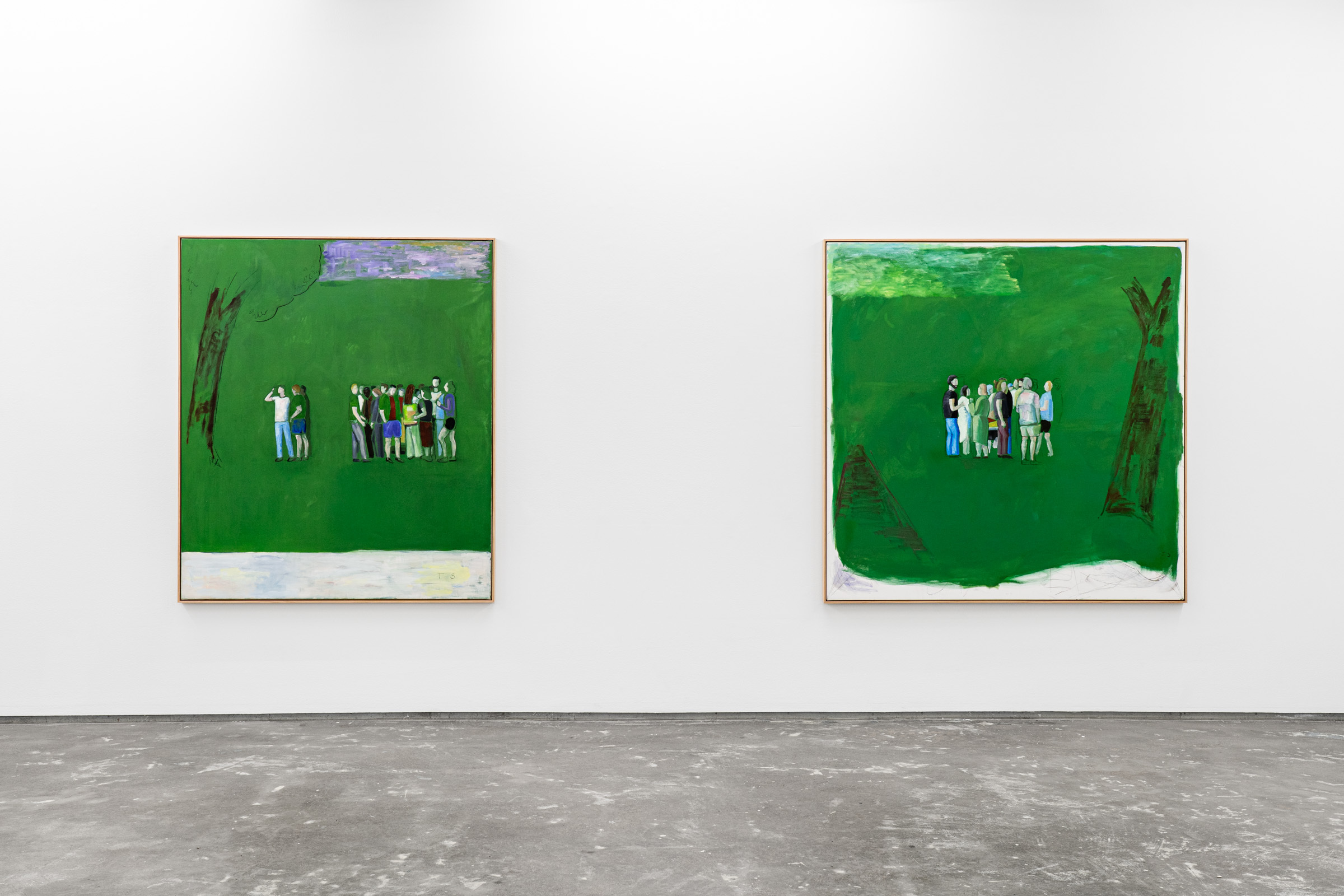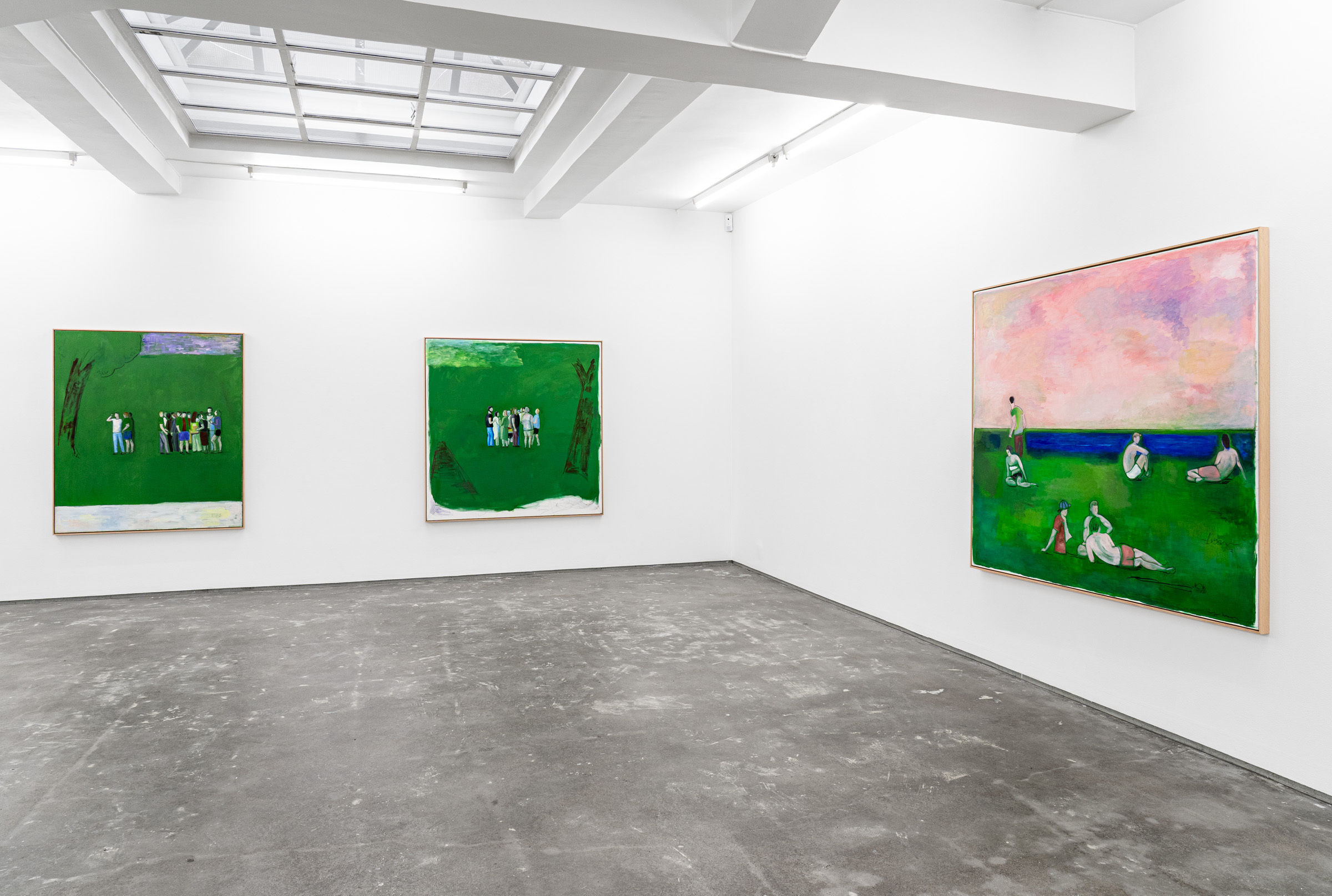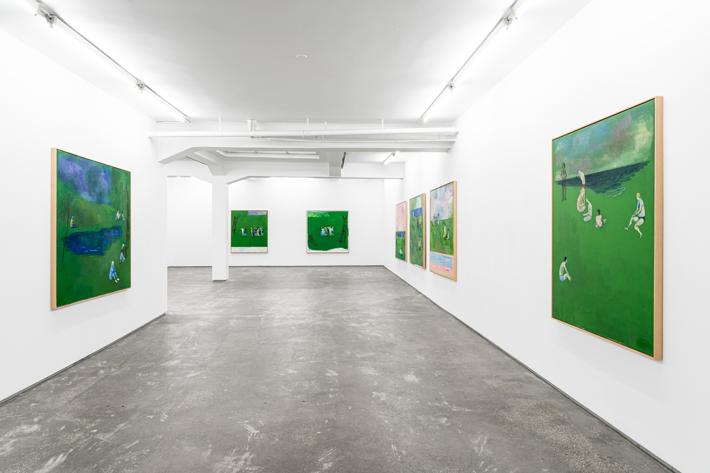 Figures emerge from lurid green canvases coupled with gestural black lines or soft painterly marks that demarcate the luscious grass, tree canopies, the horizon, the sea or the sky. Some feel cartoony, while others recall the dynamic painted skies of J.M.W Turner. “These aren’t necessarily figurative” Sørensen explains, “but are compositions made up with bodies.” Rather than attempting to capture the likeness or identity of the individuals depicted, Sørensen focuses on the atmosphere of a place through an investigation of form, line and brushwork resulting in unexpected configurations.